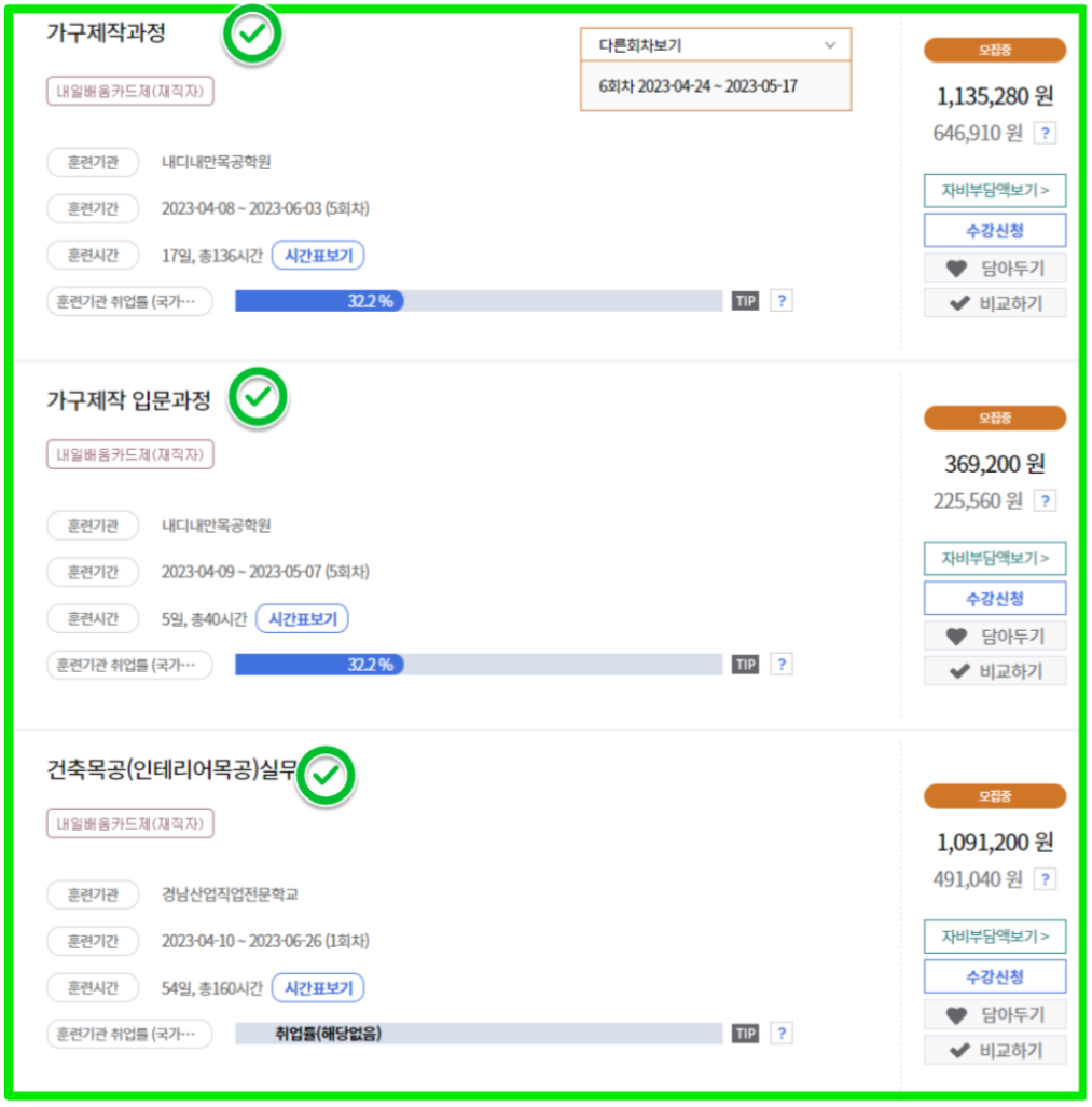 그 밖에 국민내일배움카드로 배울 수 있는 것들은 다양하며 아래의 내용을 참고로 남겨두겠습니다. 또한 HRD-NET에서 해당 과정을 검색하실 때, 자비부담액과 전액 정부지원을 구분하여 살펴보시고 본인부담금을 미리 확인하시는 것도 도움이 됩니다. 우수훈련기관을 별도로 확인할 수 있는 팁도 잊지말고 참고하시기 바랍니다.