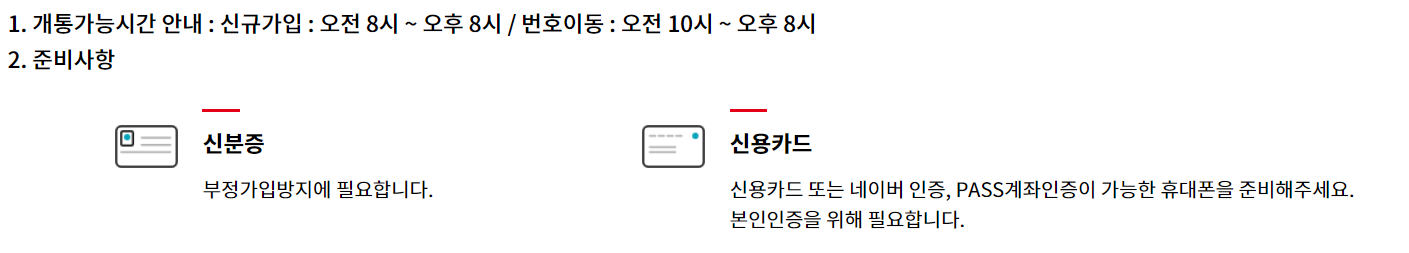 - 신규 가입의 경우 08:00 ~ 19:00(미성년/외국인 셀프개통 불가)에 가능