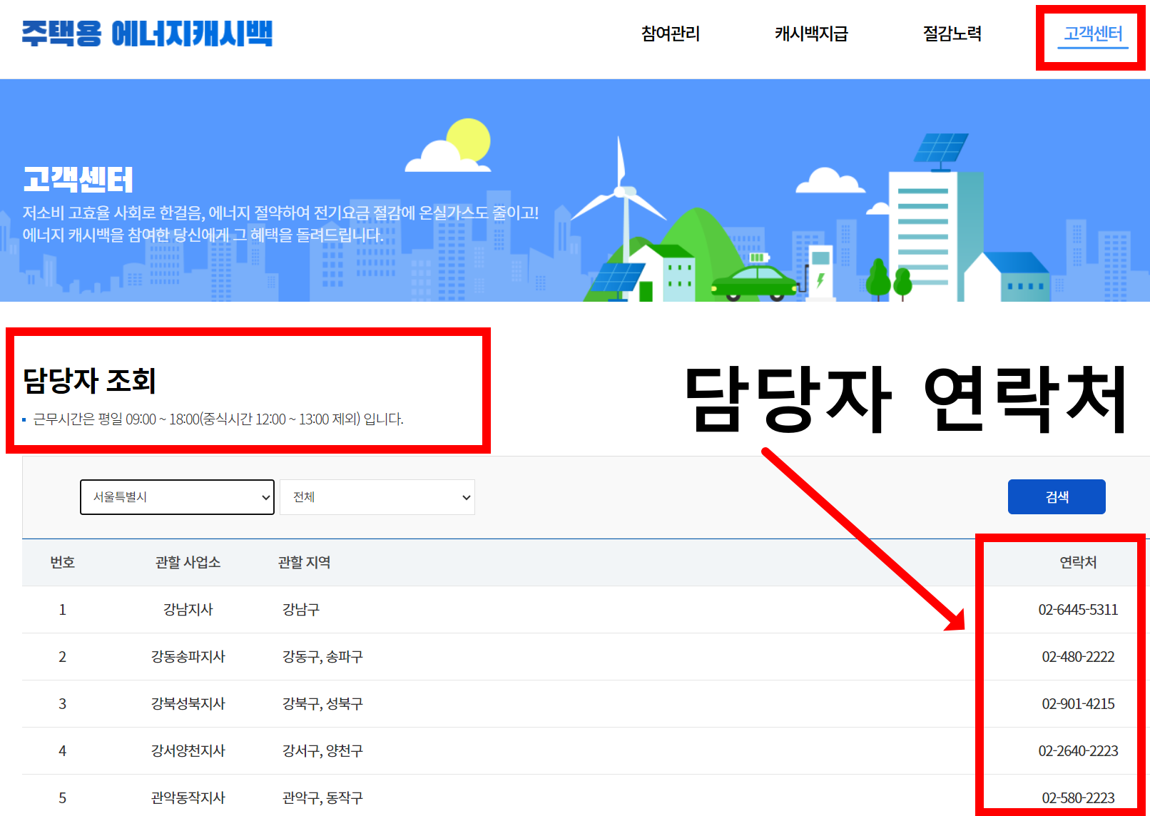 담당자 바로 연결도 가능합니다. 홈페이지에서 고객센터 ▶담당자 조회를 선택하세요.