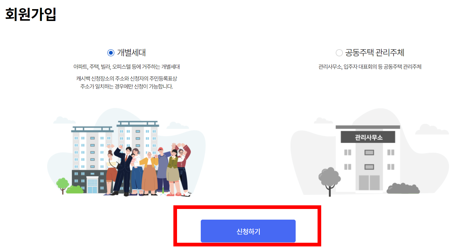 한전 에너지캐시백은 ①전국 아파트 단지와 ②개별 세대 모두가 신청 가능한 프로그램입니다.