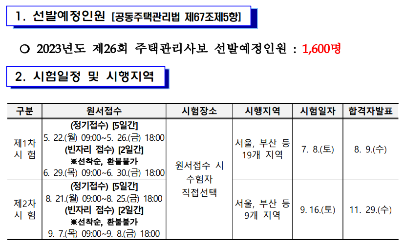 2023년 제 26회 주택관리사보 선발예정인원은 1,600명입니다.