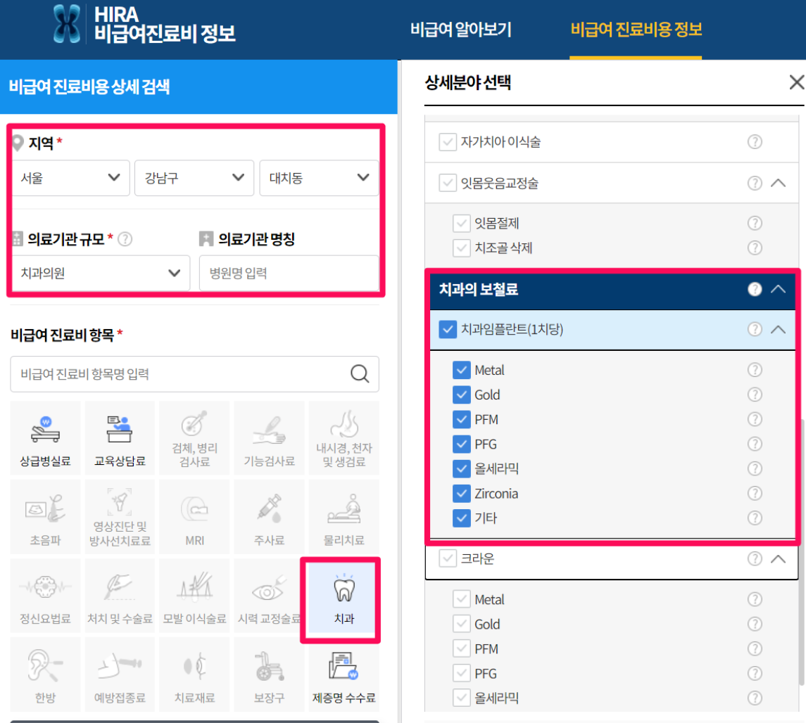 - 비급여 진료비 항목에서 '치과' 로 검색
